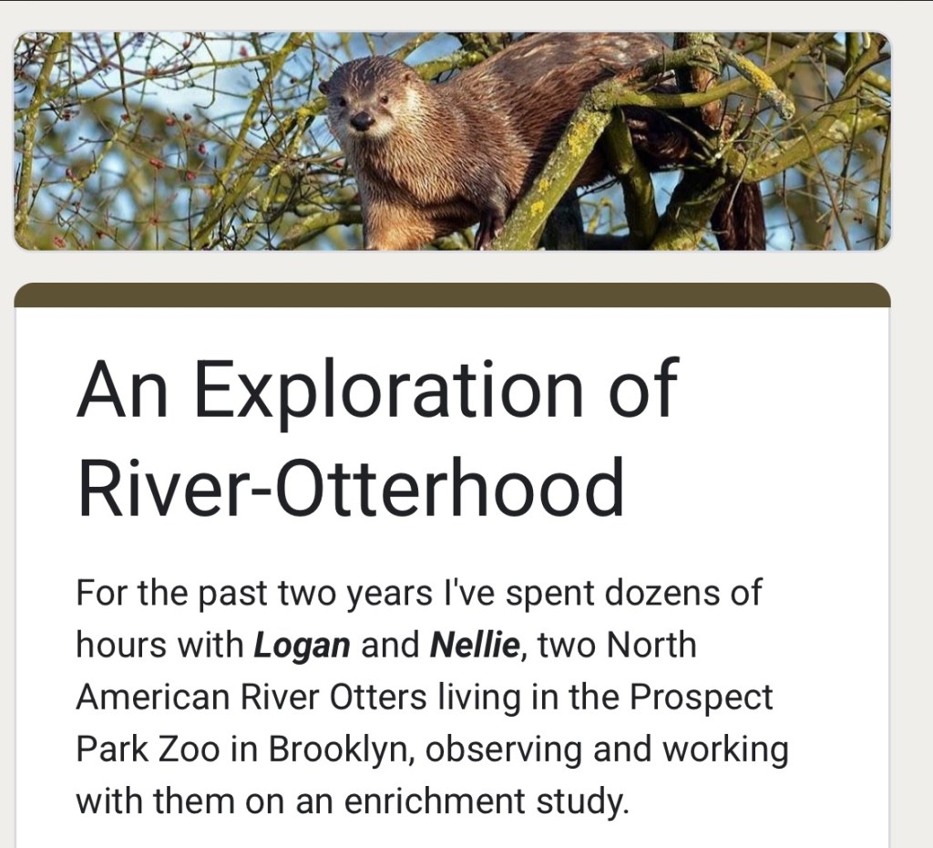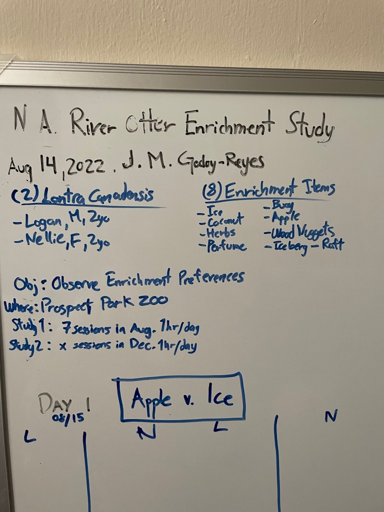 Given how essential environmental enrichment is for promoting the well-being of ex-situ animals, this ethologically-centered study was designed to better understand the enrichment preferences and behaviors of a maleโfemale pair of North American river otters (Lontra canadensis) housed at the Prospect Park Zoo in Brooklyn, New York. Throughout fourteen sessions held across six months, these otters were offered six enrichment items of varying novelty, and their behaviors were recorded via one-minute scan sampling, yielding 840 minutes of observation per otter. The study assessed the otters’ engagement with olfactory, structural, and occupational enrichments to explore the intersections of personhood and behavior. The findings indicated that enrichments not only mitigate stereotypic behaviors but also serve as a window to support more complex expressions of โotterhoodโ.