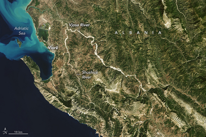 The river arises in the Pindus mountains of Epirus, Greece, and generally flows northwest. It enters Albania near รarshovรซ, and empties into the Adriatic Sea just north of Vlorรซ. Generally wild and unpolluted, the river is surrounded by the VikosโAoรถs National Park in Greece, and the Vjosa-Narta Protected Landscape near its mouth